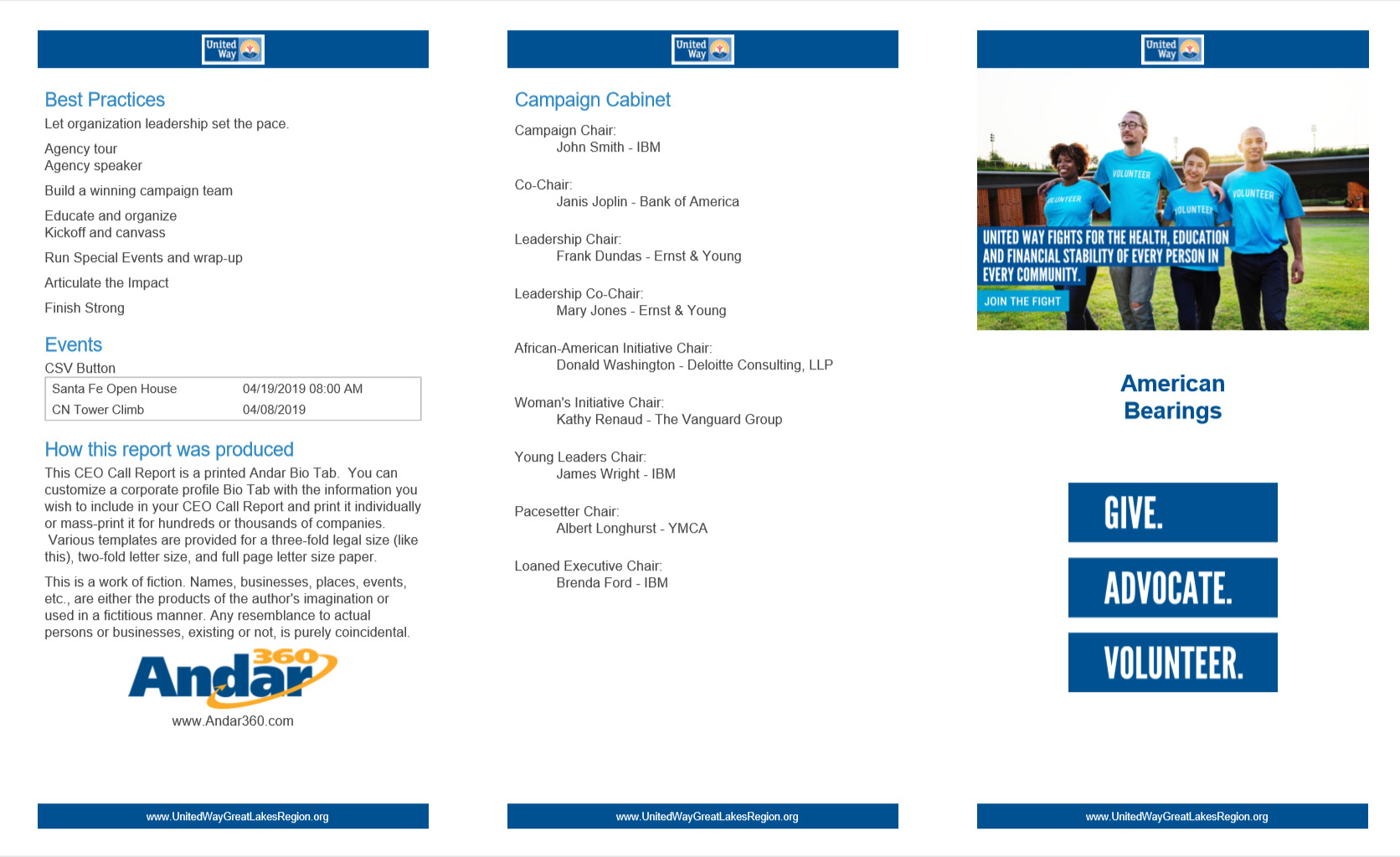 This style sheet is for American United Ways to print CEO Call Reports. This style will present data in a three-column layout, with the UWW logo.